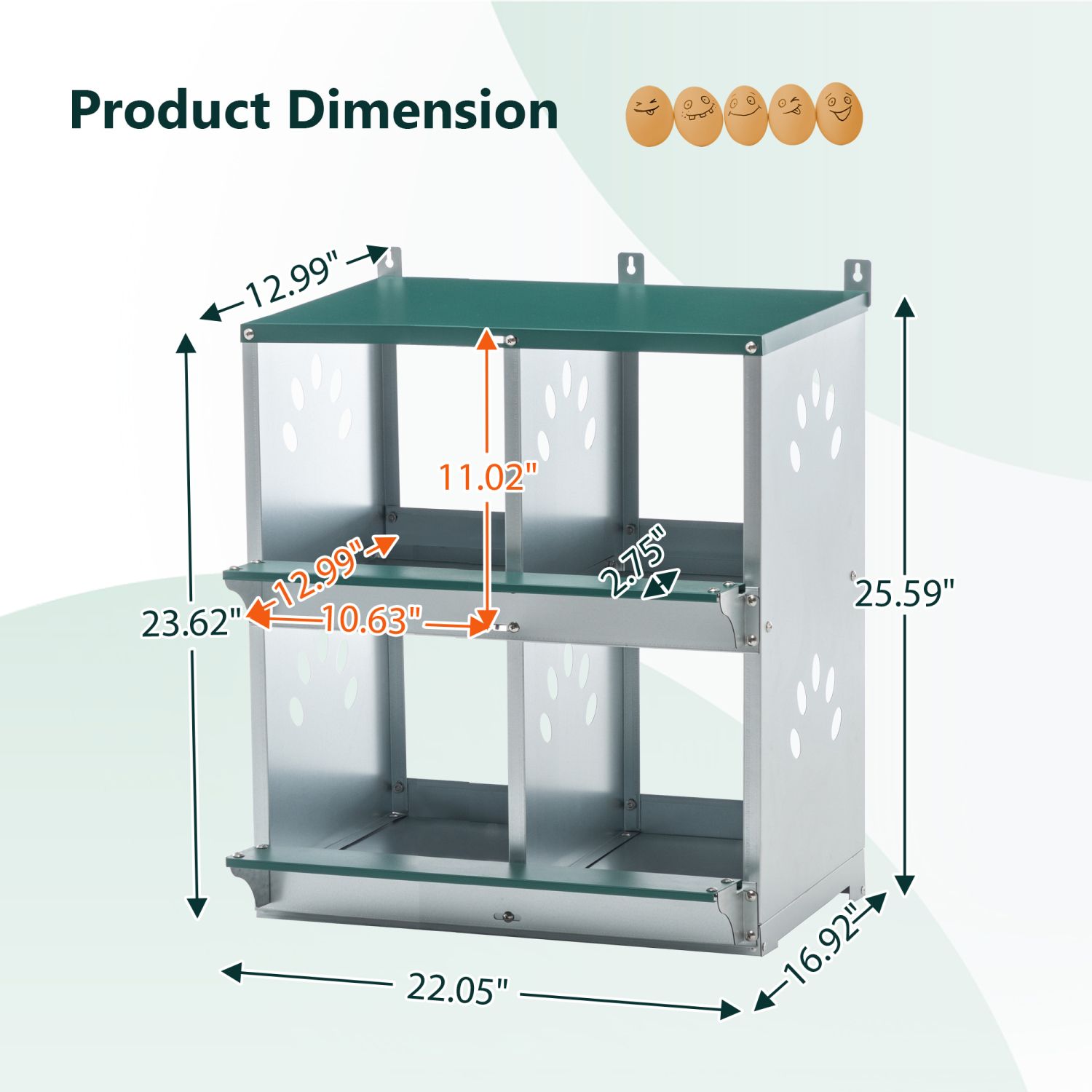 The nest box is 22.05 inches long, 16.92 inches wide, and 25.59 inches high. Each chicken coop has 4 compartments, providing ample room for movement, providing a comfortable, safe, and sheltered space for the hens to stay safe and secure, thereby promoting continuous egg production.